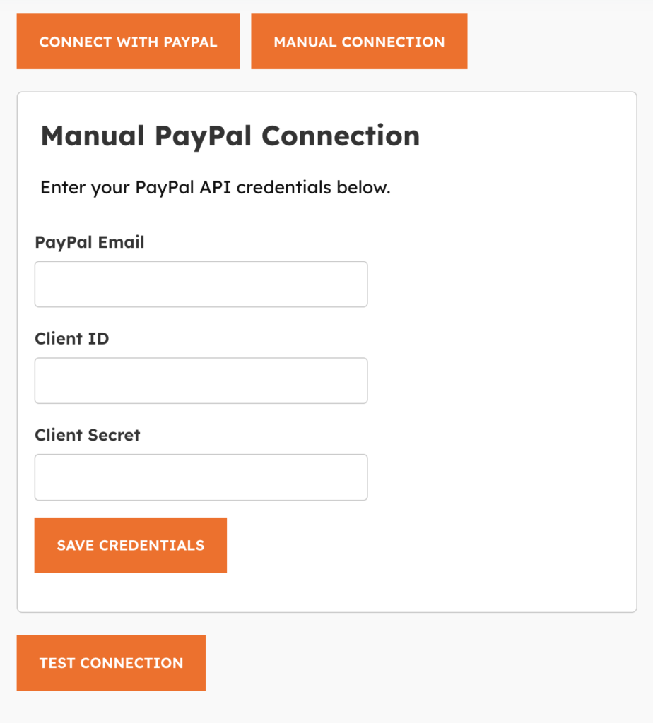 - Click the “CONNECT WITH PAYPAL” button for automatic connecting