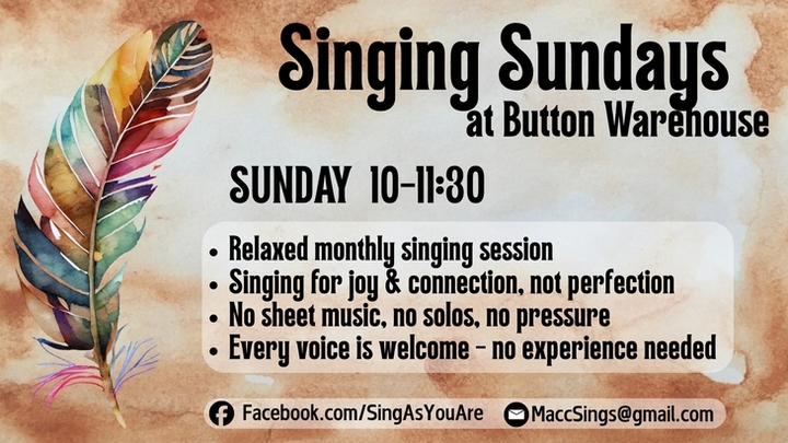 Join me for relaxed monthly community singing sessions at Button Warehouse — an uplifting way to start your Sunday.