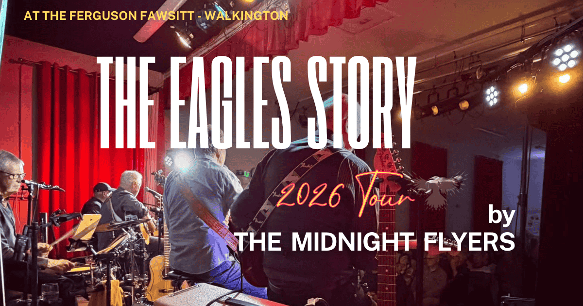 Local Eagles tribute band, the Midnight Flyers, presents The Eagles Story, a full musical journey taking you from the formation of the Eagles in the early 1970s, to their acrimonious split in 1980. The evening tells you who the band and how they evolved, through anecdotes and visual images, and how they got to be one of the most famous groups in rock history. We’ll be playing all their greatest hits in chronological order with their recognisable instrumental and vocal style.